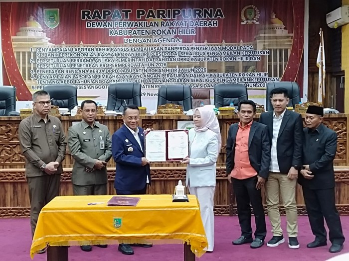 BAGANSIAPIAPI (PRO) – Dewan Perwakilan Rakyat Daerah (DPRD) Rokan Hilir bersama Pemerintah Kabupaten (Pemkab) Rohil resmi mengesahkan Rancangan Peraturan Daerah (Ranperda) tentang Anggaran Pendapatan dan Belanja Daerah (APBD) Tahun Anggaran 2026. Pengesahan dilakukan dalam rapat paripurna yang digelar pada Ahad (30/11/2025).