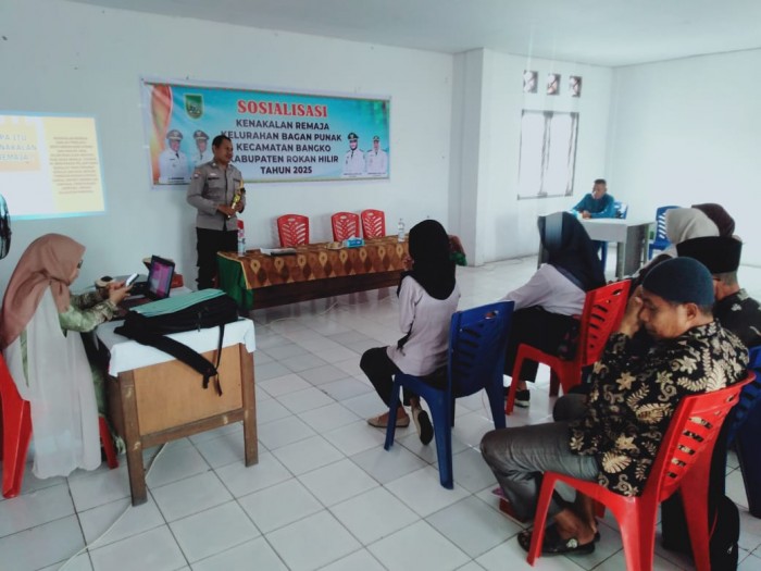 BAGANSIAPIAPI (PRO) — Pemerintah Kelurahan Bagan Punak, Kecamatan Bangko, menggelar kegiatan sosialisasi pencegahan kenakalan remaja di Aula Kantor Kelurahan Bagan Punak, Jalan Kecamatan, Senin (15/12).