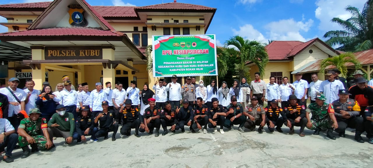 Kapolsek Kubu bersama Upika dan pemerintah Kepenghuluan melakukan apel kesiapsiagaan dalam rangka penanganan banjir di Kecamatan Kubu dan Kubu Babussalam, Rabu (15/10/2025) pagi sekitar pukul 09.00 WIB di halaman Mapolsek Kubu.